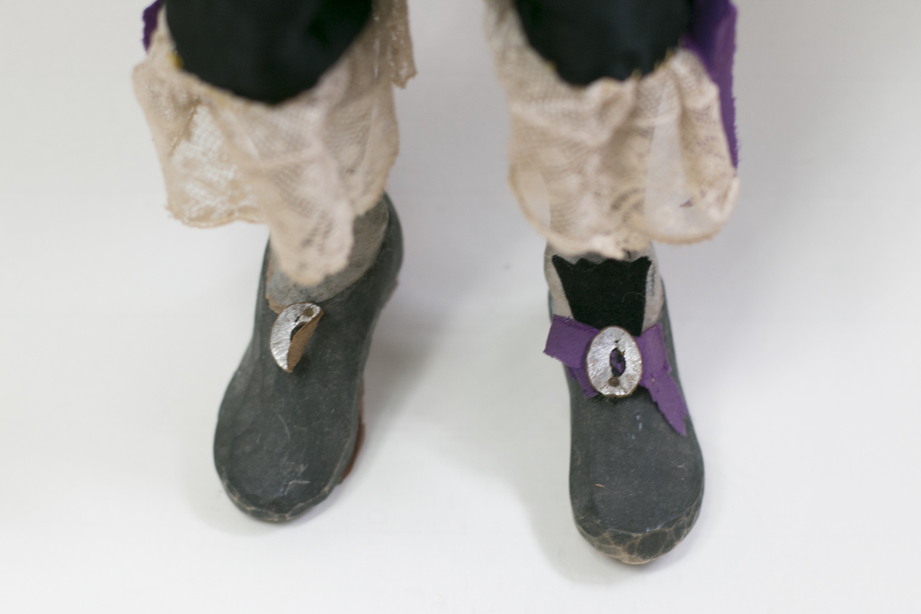 Detajli na marioneti Minister Gregor - manjkajoča mašnja na čevlju. Izdelava lutk: Šola za umetno obrt pod vodstvom Boža Pengova in kiparke Ajše Pengov. Navezava lutk: Ciril Jagodic.