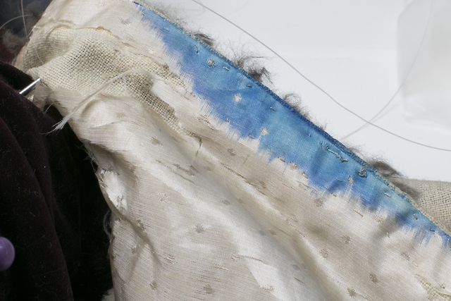 Detajl na lutki Cesarja - razpadajoča svilena podloga. Izdelava lutk: Šola za umetno obrt pod vodstvom Boža Pengova in kiparke Ajše Pengov. Navezava lutk: Ciril Jagodic.