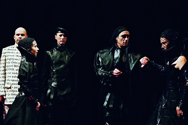 Na fotografiji: Gregor Zorc (Kriterij), Saša Mihelčič (Celija), Alojz Svete (Le Beau), Janez Škof (Vojvoda), Maja Sever (Gertruda) v uprizoritvi Kakor vam drago v režiji Sebastijana Horvata in produkciji SNG Drama Ljubljana