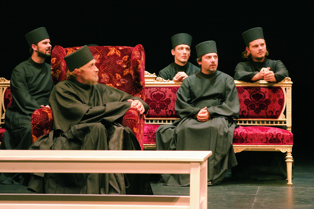 Na fotografiji: Uroš Fürst (Rakitin), Janez Škof (Starec Zosima), Marko Mandić (Oče Paisij), Bojan Emeršič (Aleksej Fjodorovič Karamazov) in Jurij Zrnec (Oče Josif) v uprizoritvi Bratje Karamazovi v režiji Mileta Koruna in produkciji SNG Drama Ljubljana