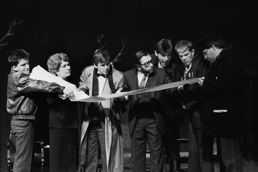 Na fotografiji: Iztok Mlakar (Novak, zadolžen za varnost, v civilu), Rastko Krošl, Jože Hrovat (Josip, teoretik), Segej Ferrari (Matko, star lisjak), Radoš Bolčina (Željko, Milkin mlajši sin), Ivo Barišič (Vili, lisjak), Milan Vodopivec (Zvonko, pisatelj).