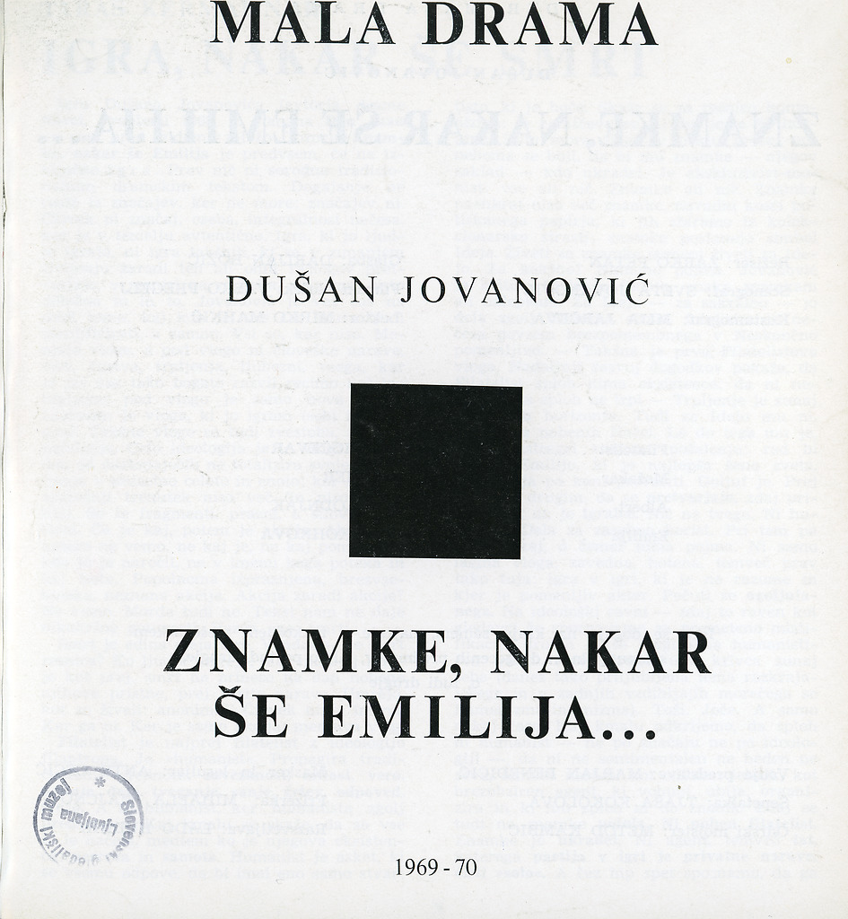 Dušan Jovanović: Znamke, nakar še Emilija (Mala drama SNG Ljubljana, prem. 7. 10. 1969 v rež. Žarko Petan)