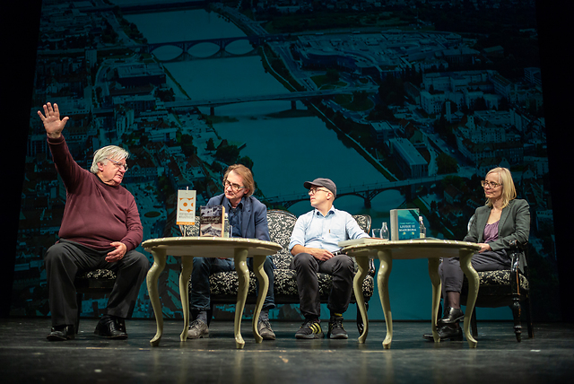 Na fotografiji: Tone Partljič, pisatelj, Aleksandar Popovski, umetniški direktor Drame SNG Maribor, Nejc Gazvoda, pisatelj in Petra Vidali, moderatorka pogovora