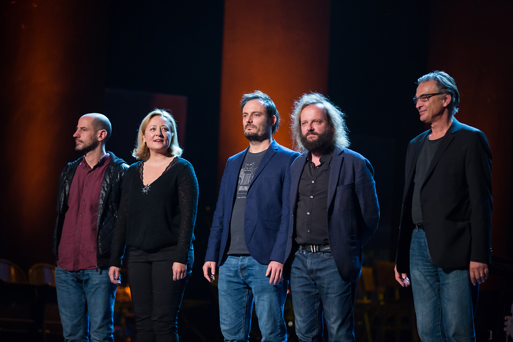 Na fotografiji: ansambel SNG Drama Ljubljana ob prejemu nagrade DGKTS za najboljšo uprizoritev sezone 2018/2019 za uprizoritev Ali: strah ti poje dušo v režiji Sebastijana Horvata
