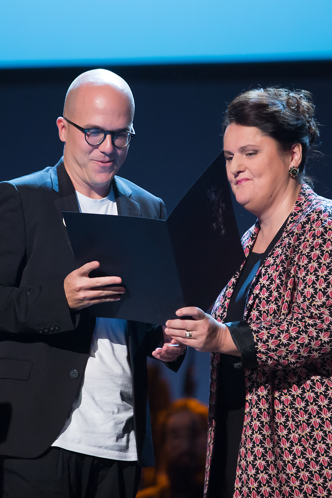 Na fotografiji: Nejc Gazvoda ob prejemu Borštnikove nagrade za izvirno dramsko besedilo predstave Tih vdih v produkciji Mestnega gledališča ljubljanskega in Uršula Cetinski, predsednica strokovne žirije 54. FBS