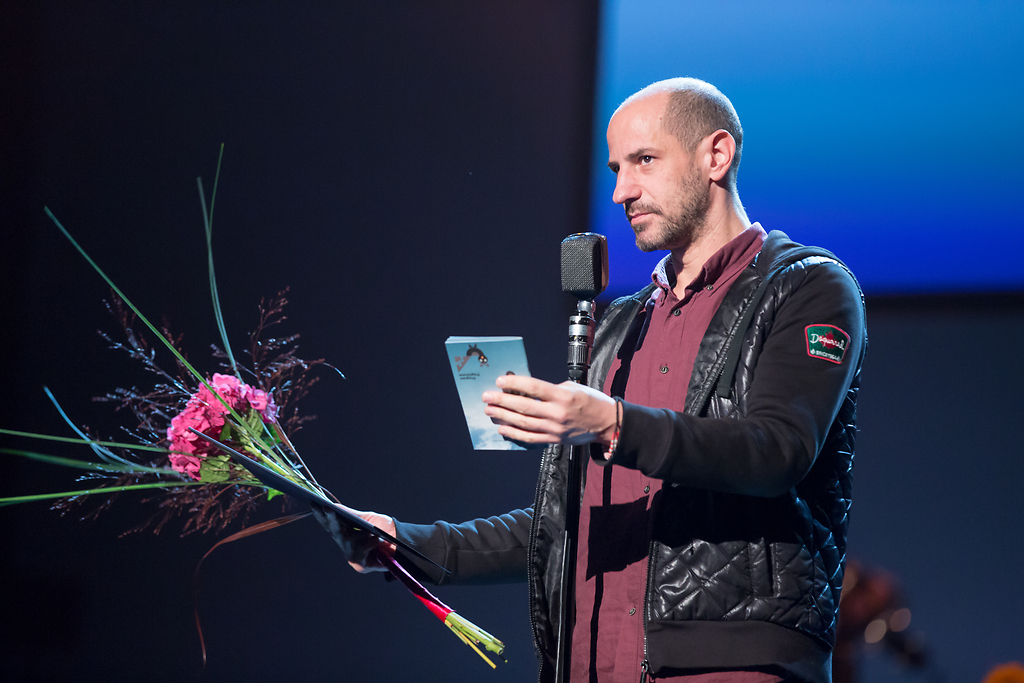Na fotografiji: Iztok Drabig Jug ob prejemu Borštnikove nagrade za igro za vlogo Salema v predstavi Ali: Strah ti pojé dušo v produkciji SNG Drama Ljubljana
