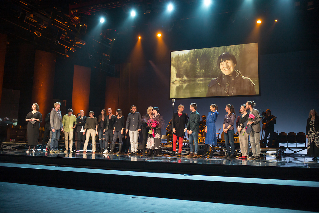 Na fotografiji: Marinka Štern, prejemnica Borštnikovega prstana 2019 in ekipa Slovenskega mladinskega gledališča