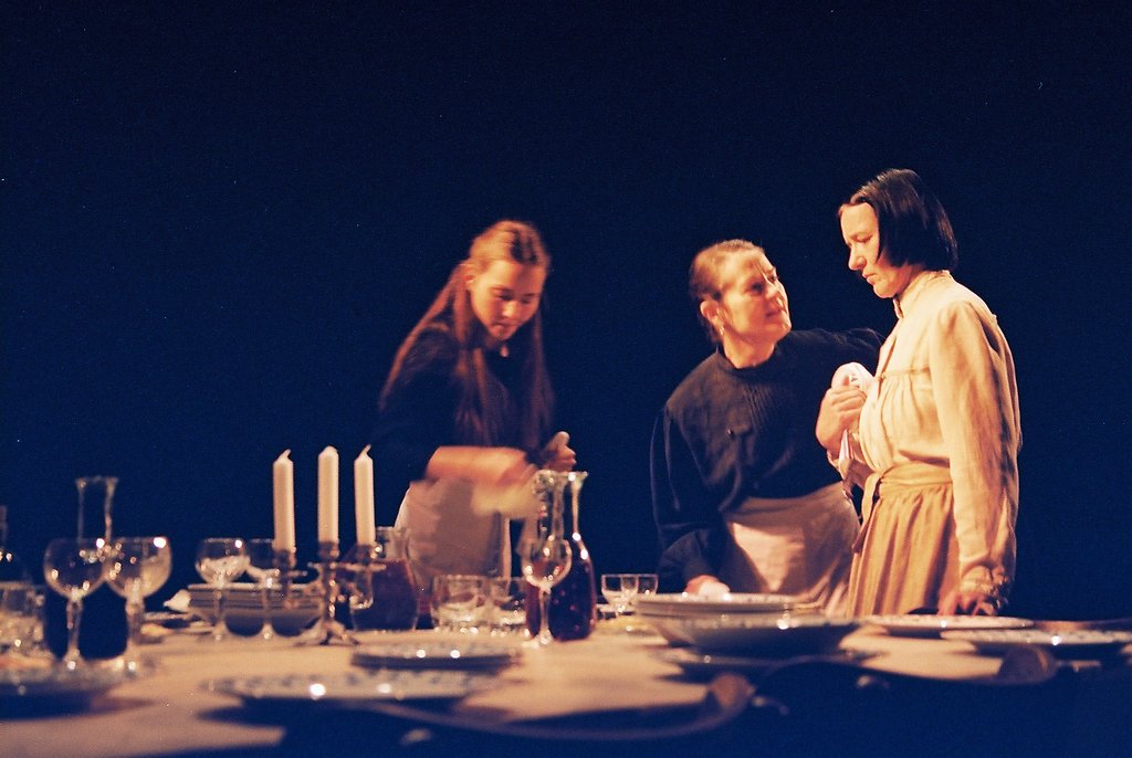 Na fotografiji: Iva Babić (Služkinja), Jadranka Tomažič (Anfisa) in Marinka Štern (Služkinja) v predstavi Tri sestre v režiji Tomi Janežiča.