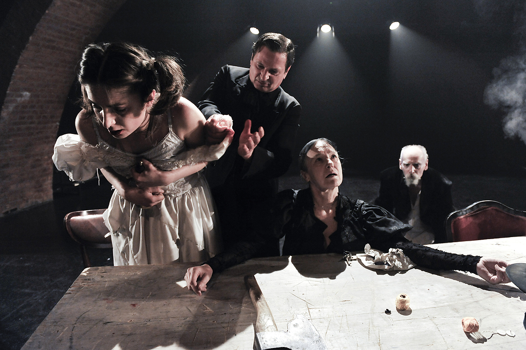Na fotografiji: Daša Doberšek (Avdotja Romanovna Raskolnikova), Željko Hrs (Pjotr Petrovič Lužin, ženin Avdotje Romanovne), Marinka Štern (Aljona Ivanovna, stara oderuhinja) in Sandi Pavlin (Semjon Zaharič Marmeladov, nekdanji titularni svetnik) v predstavi Zločin in kazen v režiji Diega de Brea.