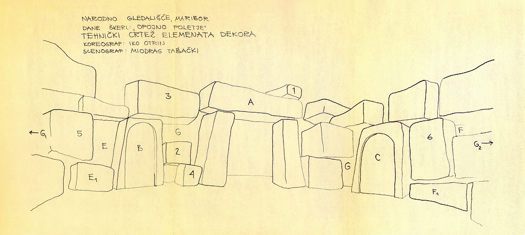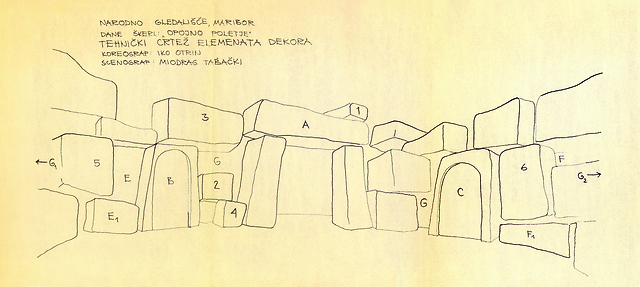 Miodrag Tabački: scenski osnutek, 29,1 x 66,1 cm, kemični svinčnik, ni podpisano, hrani Ikonoteka SLOGI – Gledališki muzej. Miodrag Tabački: stage design sketch, source: Slovenian Theatre Institute. D. Škerl: Opojno poletje / Intoxicating Summer, Opera Slovenskega narodnega gledališča v Mariboru / Opera and Ballet SNT Maribor, 1978/79.