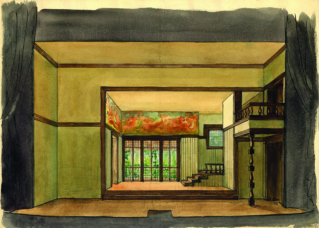 Marijan Pliberšek: scenski osnutek, 25 x 35 cm, akvarel, tuš, svinčnik, ni podpisano, hrani Ikonoteka SLOGI – Gledališki muzej. Marijan Pliberšek: stage design sketch, source: Slovenian Theatre Institute. A. d'Usseau in J. Gow: Globoko so korenine / Deep Are the Roots, Drama Slovenskega narodnega gledališča v Ljubljani / SNT Drama Ljubljana, 1948/49.