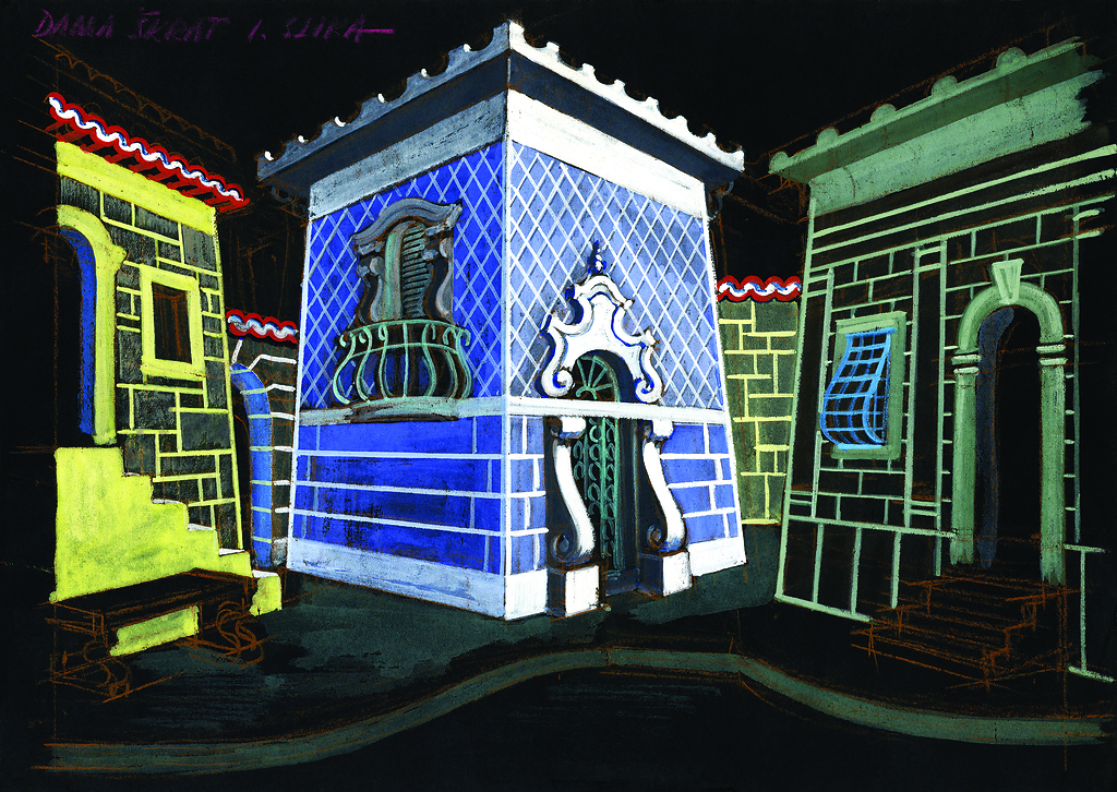Viktor Molka: scenski osnutek, 25 x 35 cm, tempera, pastel, ni podpisano, hrani Ikonoteka SLOGI – Gledališki muzej. Viktor Molka: stage design sketch, source: Slovenian Theatre Institute. P. Calderon de la Barca: Dama škrat / The Phantom Lady, Drama Slovenskega narodnega gledališča v Ljubljani / SNT Drama Ljubljana, 1949/50.