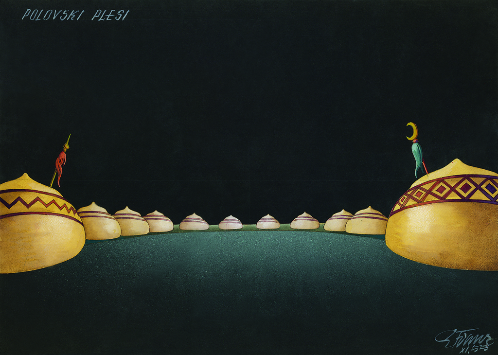 Ernest Franz: scenski osnutek, 34 x 48,1 cm, kolaž, tempera, podpisano in datirano desno spodaj, hrani Ikonoteka SLOGI – Gledališki muzej. Ernest Franz: stage design sketch, source: Slovenian Theatre Institute. A. P. Borodin: Knez Igor / Prince Igor, Opera Slovenskega narodnega gledališča v Ljubljani / SNT Opera and Ballet Ljubljana, 1945/46.