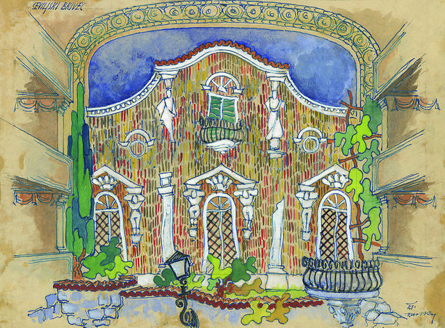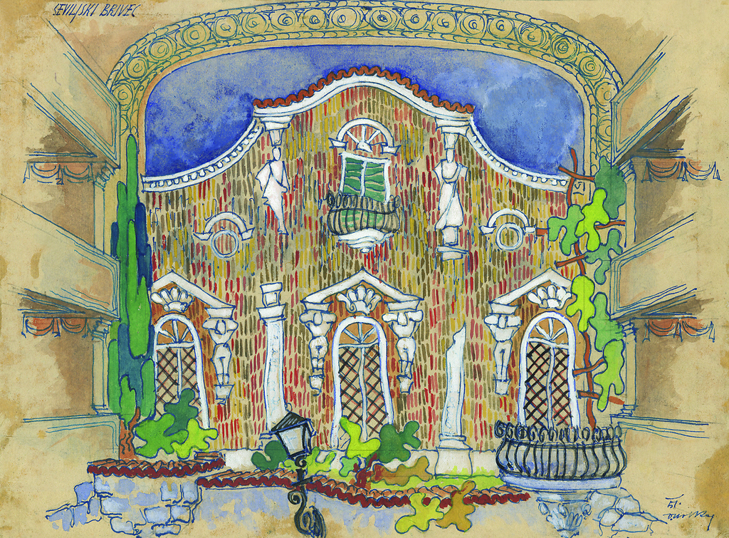 Viktor Molka: scenski osnutek, 31,2 x 42,6 cm, tempera, akvarel, tuš, podpisano in datirano desno spodaj, hrani Ikonoteka SLOGI – Gledališki muzej. Viktor Molka: stage design sketch, source: Slovenian Theatre Institute. P. A. Beaumarchais: Seviljski brivec / The Barber of Seville, Drama Slovenskega narodnega gledališča v Ljubljani / SNG Drama Ljubljana, 1950/51.