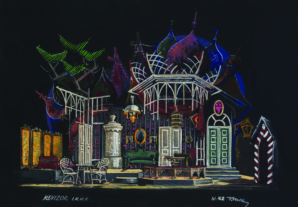 Viktor Molka: scenski osnutek, 31,2 x 42,6 cm, tempera, akvarel, podpisano in datirano desno spodaj, hrani Ikonoteka SLOGI – Gledališki muzej. Viktor Molka: stage design sketch, source: Slovenian Theatre Institute. N. V. Gogolj: Revizor / The Government Inspector, Drama Slovenskega narodnega gledališča v Ljubljani / SNT Drama Ljubljana, 1952/53.