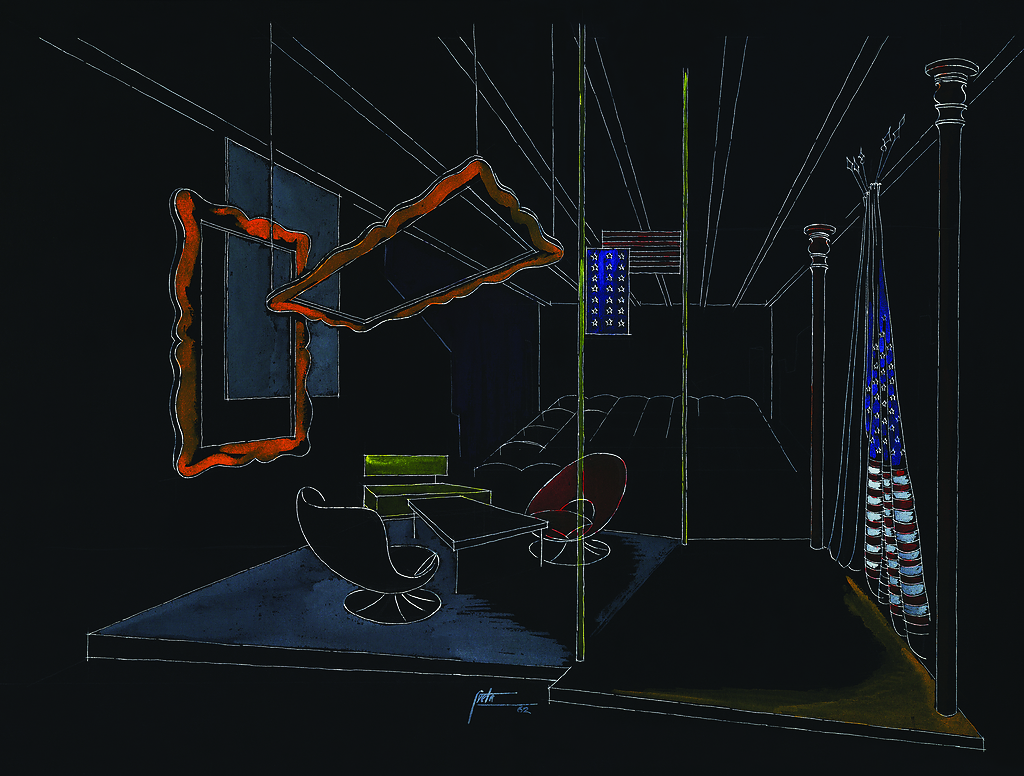 Sveta Jovanović: scenski osnutek, 47,3 x 62,4 cm, tempera, podpisano in datirano spodaj na sredini, hrani Ikonoteka SLOGI – Gledališki muzej. Sveta Jovanović: stage design sketch, source: Slovenian Theatre Institute. E. Albee: Ameriški sen / The American dream, Drama Slovenskega narodnega gledališča v Ljubljani / SNT Drama Ljubljana, 1962/63.