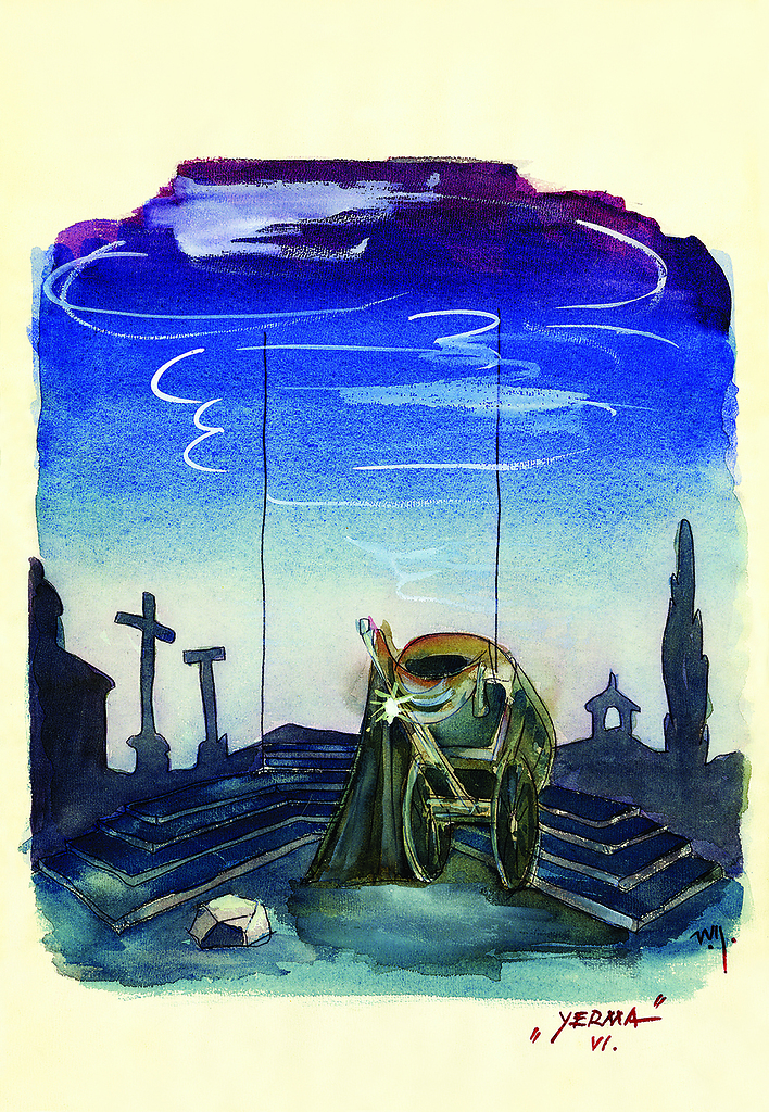 Viktor Molka: scenski osnutek, 47,5 x 33 cm, akvarel, tempera, svinčnik, podpisano desno spodaj, hrani Ikonoteka SLOGI – Gledališki muzej. Viktor Molka: stage design sketch, source: Slovenian Theatre Institute. F. G. Lorca: Yerma, Drama Slovenskega narodnega gledališča v Ljubljani / SNT Drama Ljubljana, 1959/60.