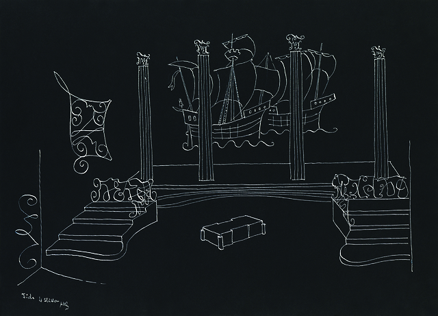 Maks Kavčič: scenski osnutek, 25,3 x 34,8 cm, bela tempera, podpisano levo spodaj, hrani Ikonoteka SLOGI – Gledališki muzej. Maks Kavčič: stage design sketch, source: Slovenian Theatre Institute. H. Purcell: Dido in Enej / Dido and Aeneas, Opera Slovenskega narodnega gledališča v Ljubljani / SNT Opera and Ballet Ljubljana, 1959/60.