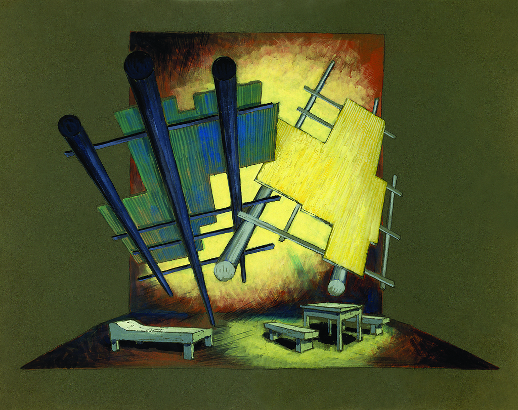 Viktor Molka in Vladimir Rijavec: scenski osnutek, 39,7 x 50 cm, tempera, ni podpisano, hrani Ikonoteka SLOGI – Gledališki muzej. Viktor Molka and Vladimir Rijavec: stage design sketch, source: Slovenian Theatre Institute. J. Cikker: Juro Jánošik, Opera Slovenskega narodnega gledališča v Ljubljani / SNT Opera and Ballet Ljubljana, 1962/63.