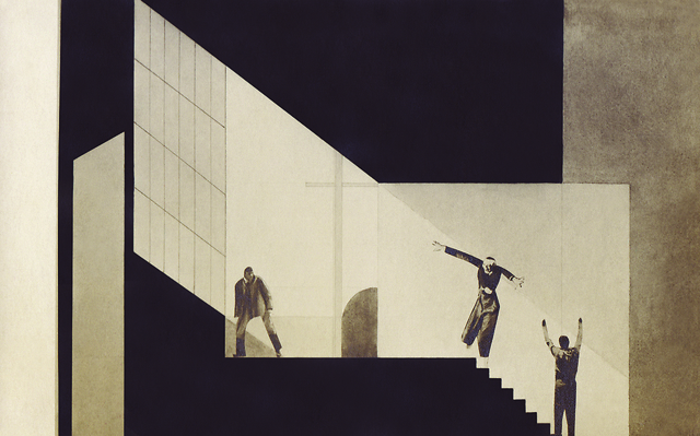 Marij Kogoj: Črne maske, nerealizirana scenografija Edvarda Stepančiča, fotografija, 1928, hrani Ikonoteka SLOGI – Gledališki muzej. Marij Kogoj: Black Masks, unrealised stage design by Edvard Stepančič, source: Slovenian Theatre Institute.