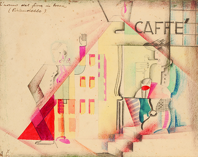 Avgust Černigoj: scenski osnutek, 13,1 x 16,5 cm, kolaž, akvarel, barvni svinčniki, hrani Ikonoteka SLOGI – Gledališki muzej. Avgust Černigoj: stage design sketch, source: Slovenian Theatre Institute. L. Pirandello: L'uomo dal fiore in bocca, verjetno oder sv. Jakoba v Trstu / probably St. James’s Stage in Trieste, okrog / around 1926.