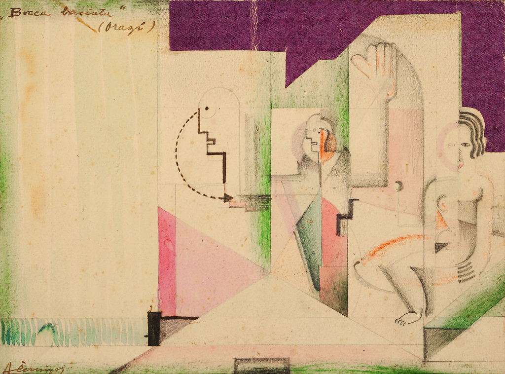 Avgust Černigoj: scenski osnutek, 16 x 12,3 cm, lepljenka, hrani Ikonoteka SLOGI – Gledališki muzej. Avgust Černigoj: stage design sketch, source: Slovenian Theatre Institute. Bocca Baciata, verjetno oder sv. Jakoba v Trstu / probably St. James’s Stage in Trieste, okrog / around 1926.