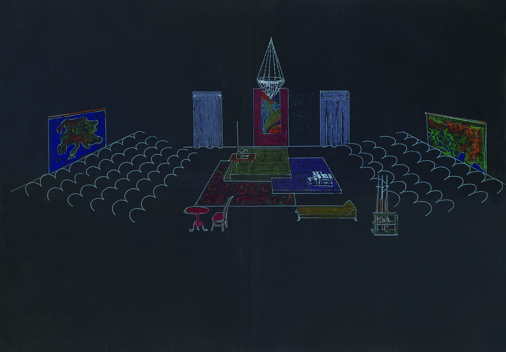Jakob Savinšek: scenski osnutek, 49,6 x 70,3 cm, pastel, podpisano in datirano desno spodaj, hrani Ikonoteka SLOGI – Gledališki muzej. Jakob Savinšek: stage design sketch, source: Slovenian Theatre Institute. P. Kozak: Afera / The Affair, Oder 57 / Stage 57, 1960/61.