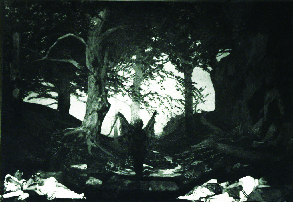 Milan Klemenčič, scenografija predstave, fotografija, vir: Ikonoteka SLOGI – Gledališki muzej. Milan Klemenčič, stage design photograph, source: Slovenian Theatre Institute. W. Shakespeare: Sen kresne noči / A Midsummer Night's Dream, Drama Narodnega gledališča v Ljubljani / SNT Drama Ljubljana, 1920/21.