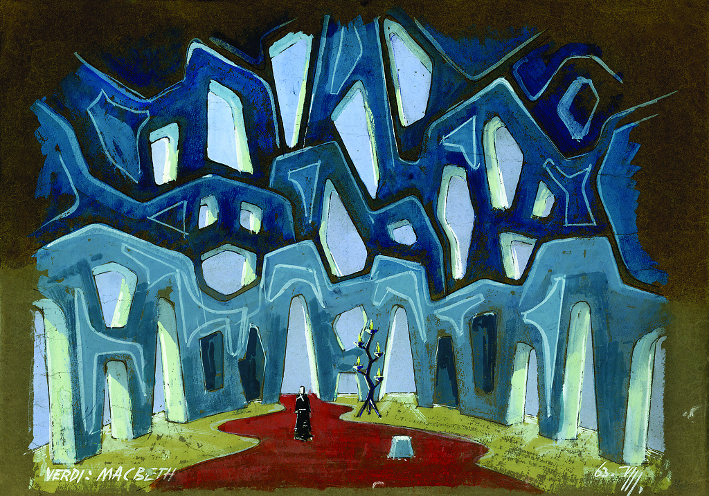 Viktor Molka: scenski osnutek, 44,9 x 64,5 cm, tempera, podpisano in datirano desno spodaj, hrani Ikonoteka SLOGI – Gledališki muzej. Viktor Molka: stage design sketch, source: Slovenian Theatre Institute. G. Verdi: Macbeth, Opera Slovenskega narodnega gledališča v Ljubljani / SNT Opera and Ballet Ljubljana, 1963/64.