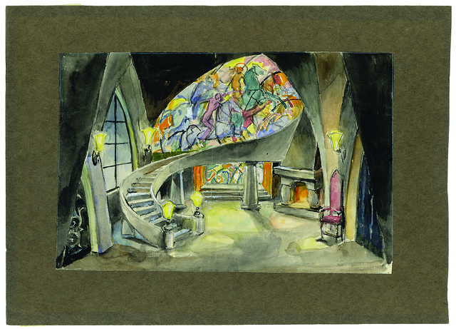 Ivan Vavpotič: scenski osnutek, 24,9 x 35 cm, svinčnik, akvarel, tempera, ni podpisano, hrani Ikonoteka SLOGI – Gledališki muzej. Ivan Vavpotič: stage design sketch, source: Slovenian Theatre Institute. M. Kogoj: Črne maske / Black Masks, Opera Narodnega gledališča v Ljubljani / SNT Opera and Ballet Ljubljana, 1928/29.