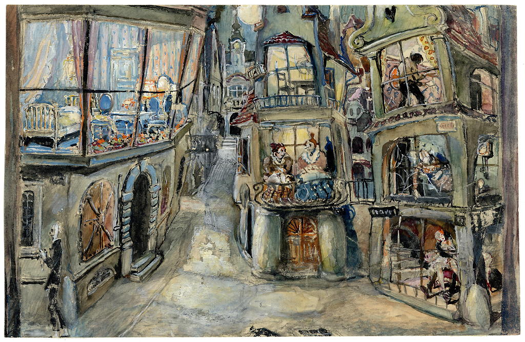 Ivan Vavpotič: scenski osnutek, 22 x 34,5 cm, mešana tehnika (svinčnik, tuš, akvarel, tempera, pastel), ni podpisano, hrani Ikonoteka SLOGI – Gledališki muzej. Ivan Vavpotič: stage design sketch, source: Slovenian Theatre Institute. S. Grum: Dogodek v mestu Gogi / An Event in the Town of Goga, Drama Narodnega gledališča v Ljubljani / SNT Drama Ljubljana, 1931/32.