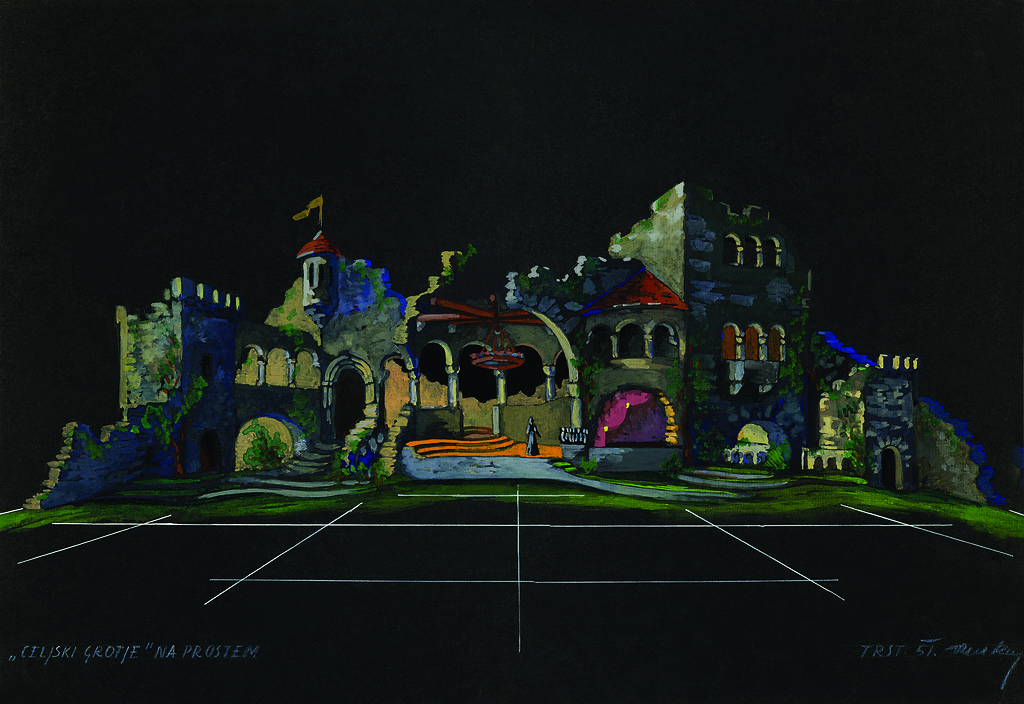 Viktor Molka: scenski osnutek, 31,5 x 45 cm, tempera, podpisano in datirano desno spodaj, hrani Ikonoteka SLOGI – Gledališki muzej. Viktor Molka: stage design sketch, source: Slovenian Theatre Institute. B. Kreft: Celjski grofje / The Counts of Celje, Slovensko narodno gledališče za Svobodno tržaško ozemlje / SNT for the Free Territory of Trieste, 1950/51.
