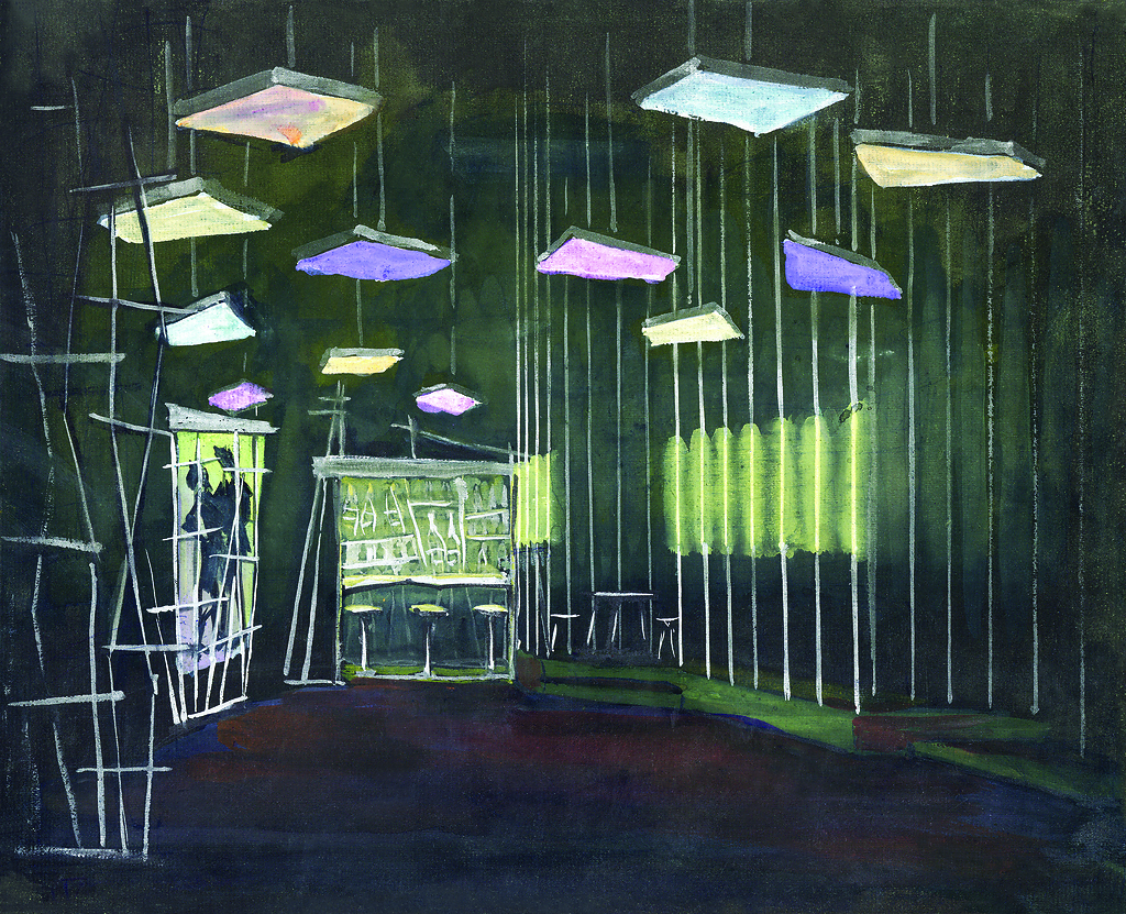 Marijan Pliberšek: scenski osnutek, 28,5 x 34,8 cm, tempera, srebrni svinčnik, ni podpisano, hrani Ikonoteka SLOGI – Gledališki muzej. Marijan Pliberšek: stage design sketch, source: Slovenian Theatre Institute. D. Švara: Nina, Opera Slovenskega narodnega gledališča v Ljubljani / SNT Opera and Ballet Ljubljana, 1963/64.