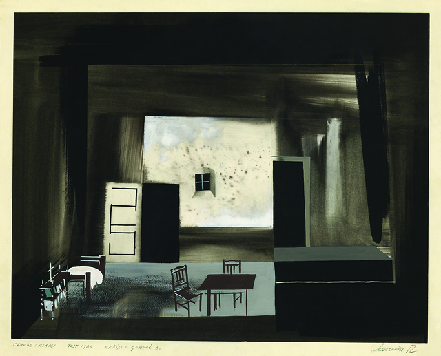 Avgust Lavrenčič: scenski osnutek, 37,7 x 45,8 cm, tempera, ni podpisano, hrani Ikonoteka SLOGI – Gledališki muzej. Avgust Lavrenčič: stage design sketch, source: Slovenian Theatre Institute. I. Cankar: Hlapci / The Serfs, Slovensko gledališče v Trstu / Slovenian Theatre in Trieste, 1965/66.