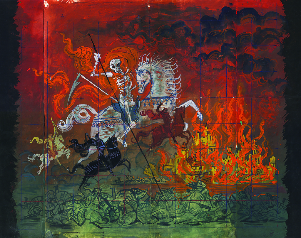 Vladimir Žedrinski: scenski osnutek, 55 x 71 cm, tempera, ni podpisano, hrani Ikonoteka SLOGI – Gledališki muzej. Vladimir Žedrinski: stage design sketch, source: Slovenian Theatre Institute. M. P. Musorgski: Hovanščina / Khovanschina, Opera in balet Slovenskega narodnega gledališča v Ljubljani / SNT Opera and Ballet Ljubljana, 1971/72.
