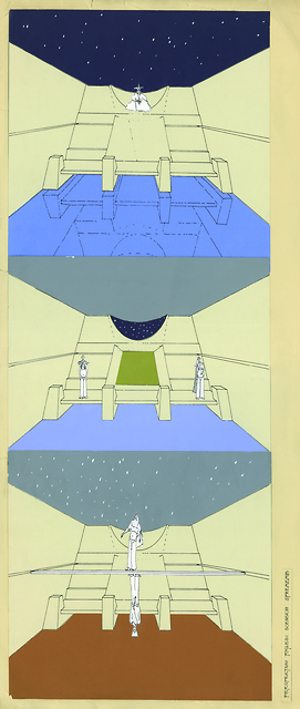 Marko Japelj: scenski osnutek, 55,5 x 29,5 cm, tempera, tuš, papir, ni podpisano, hrani Marko Japelj Marko Japelj: stage design sketch, source: Marko Japelj. I. Svetina: Šeherezada / Scheherezada, Slovensko mladinsko gledališče / Mladinsko Theatre, 1988/1989.