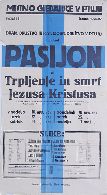Plakat za predstavo Nikolausa Deutscha Pasijon ali trpljenje in smrt Jezusa Kristusa, v režiji Vala Bratine. Mestno gledališče Ptuj, 1926/27, slika 7