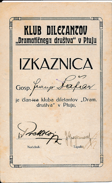 Članska izkaznica Kluba diletantov Dramatičnega društva v Ptuju na ime Franjo Šafar, slika 9
