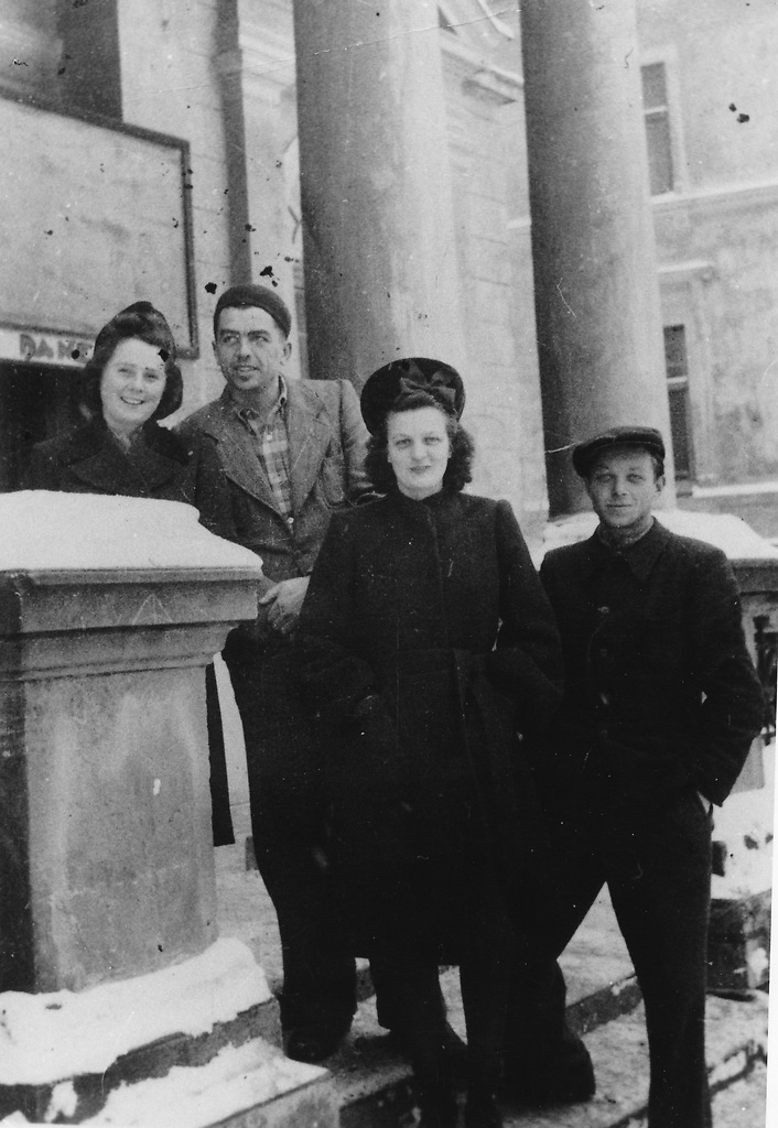 Igralec in režiser Albert Wilhelm in njegova žena, tudi igralka, Nada ter režiser Jože Babič pred gledališčem Ptuj leta 1940, slika 16