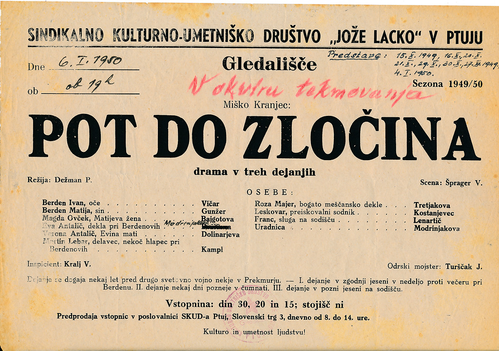Plakat za predstavo Pot do zločina Gledališča Sindikalnega kulturno umetniškega društva Jože Lacko v Ptuju v sezoni 1949/50, slika 12
