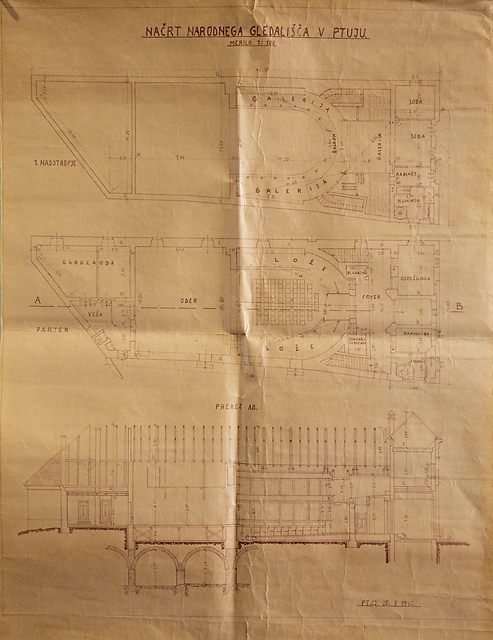 Prerezi Narodnega gledališča Ptuj (nadstropje, parter, prerez AB), 1945, slika 16