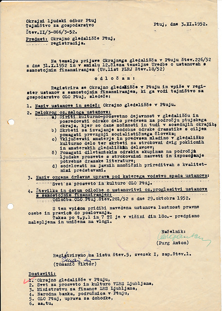 Odločba o vpisu Okrajnega gledališča Ptuj v register ustanov s samostojnim financiranjem, 3. november 1952, slika 1