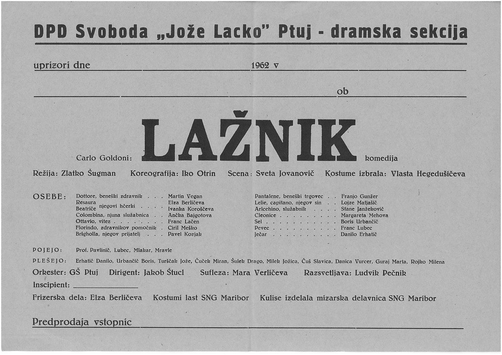Plakat predstave Lažnik v režiji Zlatka Šugmana. DPD Svoboda "Jože Lacko" Ptuj – dramska sekcija, 1961/62, slika 5