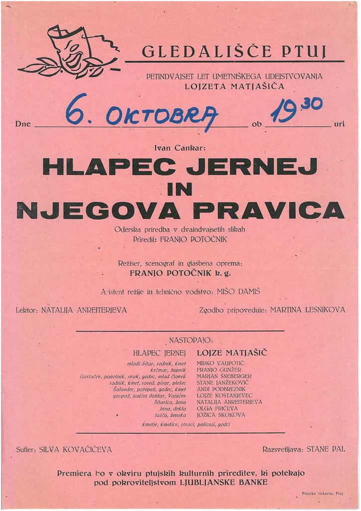 Plakat predstave Hlapec Jernej v režiji Franja Potočnika. Gledališče Ptuj, 1973/74, slika 6