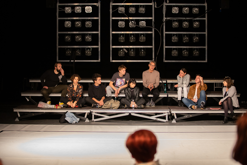 Pogovor z ustvarjalci predstave Rumena luna (od leve proti desni): Rok Kunaver, Neža Dvorščak, Maks Mihajlović, Tibor Anželj, Ronja Matijevec, Primož Ekart (režiser), Alenka Tetičkovič in Jan Bučar. Pogovor je vodila Nika Švab (skrajno desno)