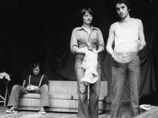 Na fotografiji: Marjan Trobec (Jimmy Porter), Milada Kalezić (Helena Charles) in Peter Boštjančič (Cliff Lewis) v uprizoritvi Ozri se v gnevu v režiji Marjana Bevka (takratnega absolventa gledališke režije)
