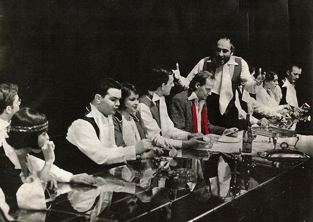 Na fotografiji: Mirjana Šajinović (Johana), Jure Ivanušič (Johannes), Zoran More (Gougou), Irena Varga (Luiza), Davor Herga (Pschirer), Miloš Battelino (Baal), Peter Boštjančič (Bolleboll), Iztok Bevk (mladi umetnik), Maša Židanik (Zofija Dechant) in Alojz Svete (John) v predstavi Baal v režiji Jerneja Lorencija