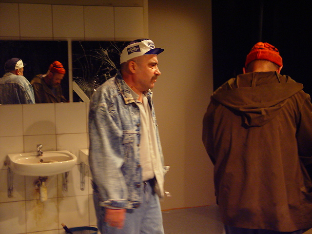 Na fotografiji: Peter Boštjančič (Ivek, Rafko) in Vlado Novak (Albin, Branko) v predstavi Štefka Milan v režiji Matjaža Latina