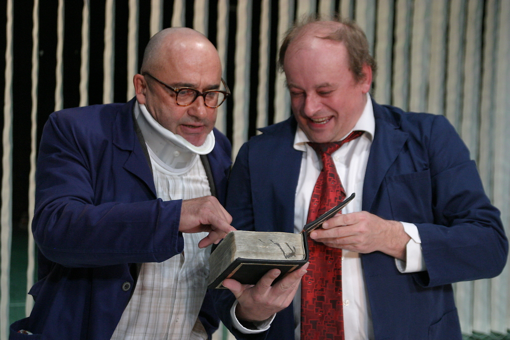 Na fotografiji: Peter Boštjančič (nadučitelj) in Gojmir Lešnjak Gojc (Komar) v predstavi Hlapci.pdf v režiji Samota M. Strelca