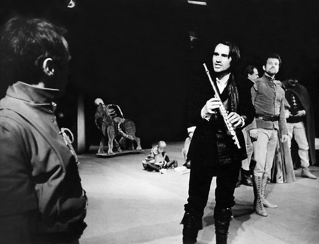 Na fotografiji v ospredju: Bogomir Veras (Gildenstern), Peter Boštjančič (Hamlet), Borut Alujevič (Rozenkranc)
